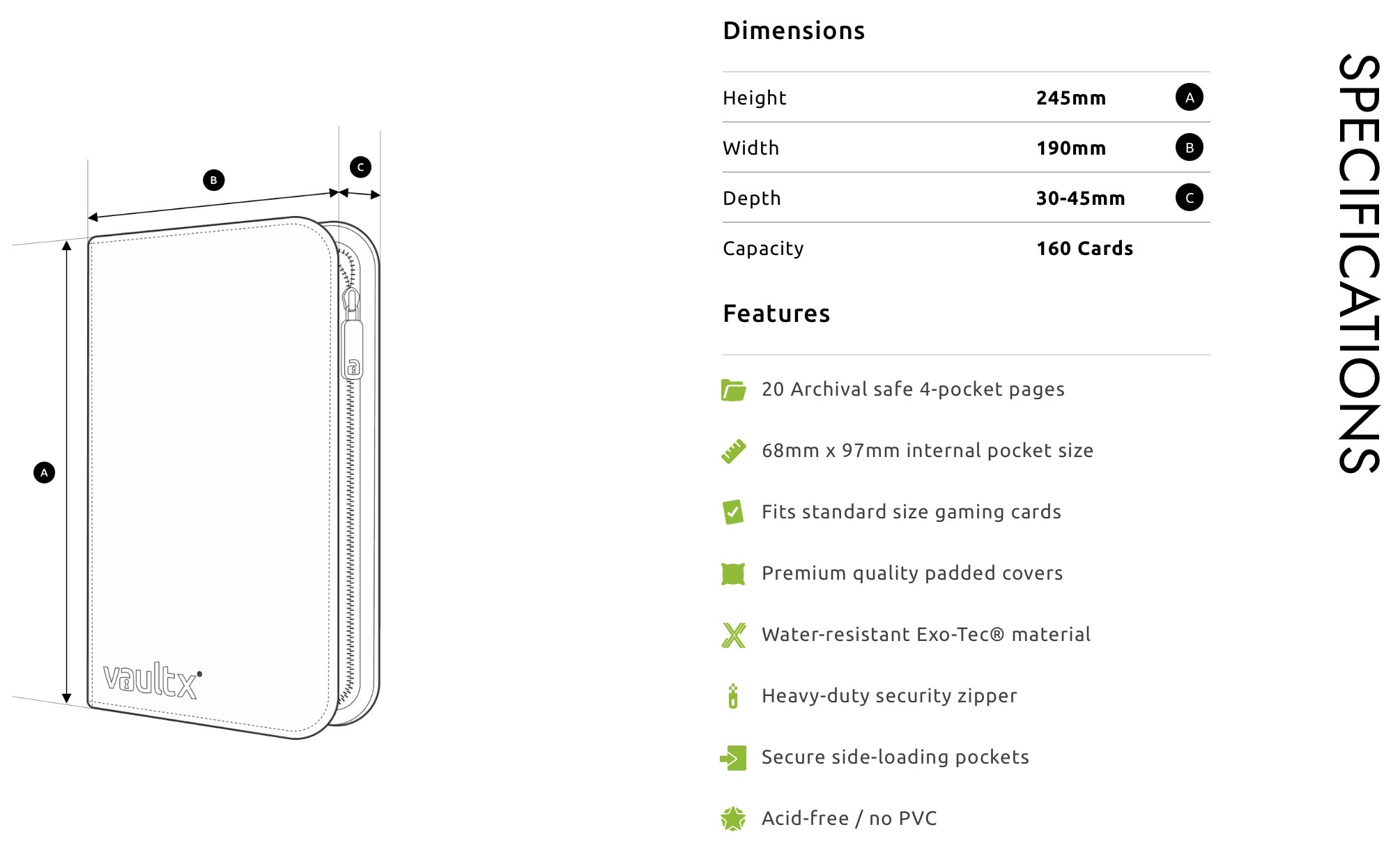 4 pocket per page premium quality zip-up trading card binder. With padded, extra rigid front and rear covers made from non-slip, water resistant Exo-Tec®material. 20 pages holding 160 cards. Made from archival-safe, acid-free non-PVC material.